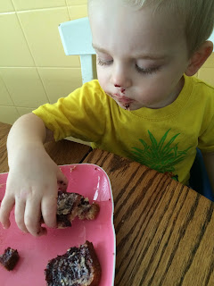 Nana made chocolate banana bread at 7:30pm (Hendrix's bedtime) and he got to stay up late to help. We LOVE Nana's treats....maybe a little too much. Nana, Papa, and I are all trying to eat healthier and lose some weight and it's difficult with so many yummy things to bake?